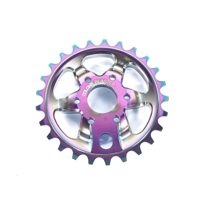 The Colony Blaster 28T Sprocket Rainbow Oilslick is a precision CNC-machined component designed to enhance torque efficiency on your bike, making it easier to perform aerial tricks. This BMX Freestyle sprocket is the signature model of rider Chris James. I